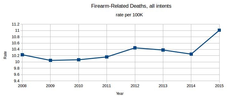 Fine. Let’s allow that for purposes of discussion. We still have a problem. According to CDC’s WISQARS, firearms-related deaths (all intents) for 2008-2015 is