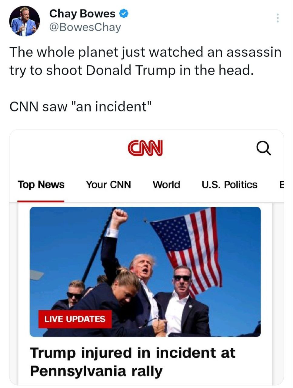Reaction has been from the sarcastic to the unbelievably stupid. The first one is humor, the second one is an actual CNN aka #Fake News headline. Yep, it just didn’t happen, no one tried to kill President Trump, he “fell”. Dear lord these are very stupid people and or just that corrupt. Its no wonder cnn has like 12 viewers.