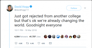 …says one of the founders of NA MSD, who one might think speaks officially for the group. And who is blissfully unaware that school shootings are down. Even leftist NPR knows that.